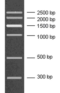 6 DNA fragments: 300, 500, 1000, 2000, 2500bp: 6 DNA fragments: 300, 500, 1000, 1500, 2000, 2500bp The intensity of the 1500bp band is increased to yield an internal reference indicator